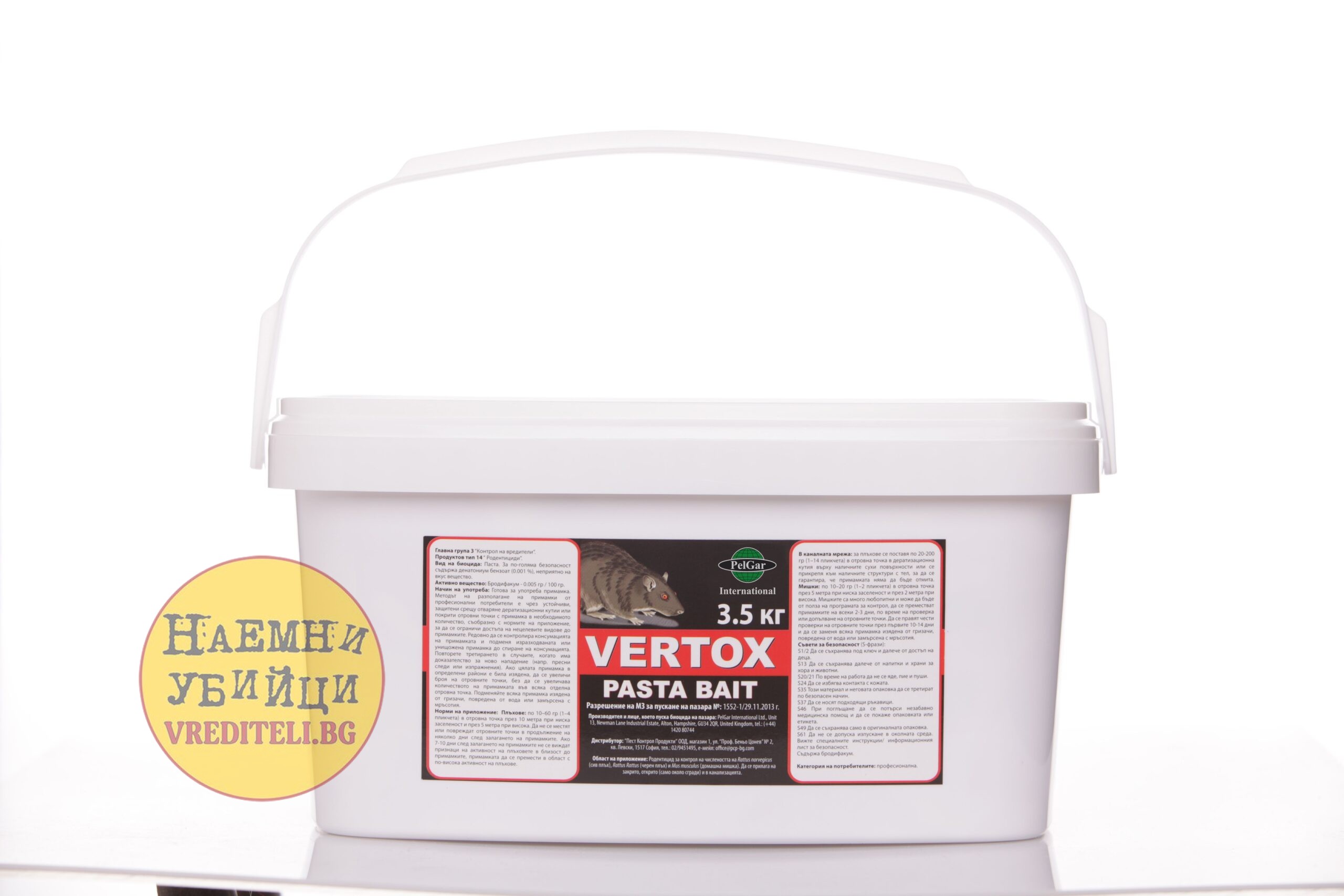 Начин на употреба на Вертокс паст от 20 кг: Залага се в кутии или панички на места, където има активност на гризачите. Прилага се “импулсна техника”, като след първоначалното залагане се изчаква 8-10 дни и тогава се залага повторно (не се дозарежда, едно ядене убива).